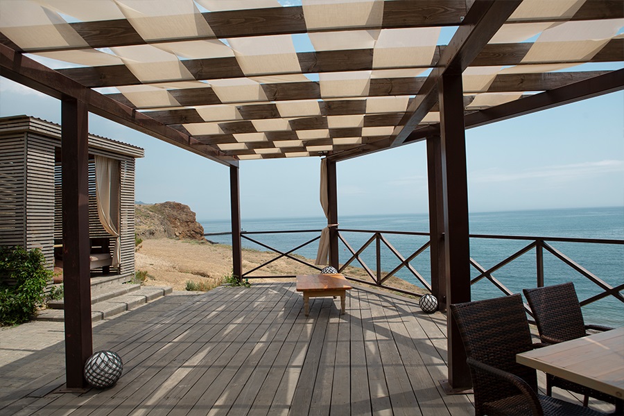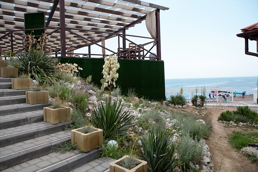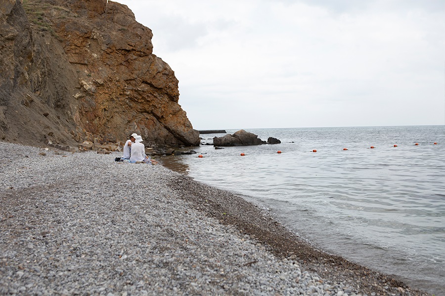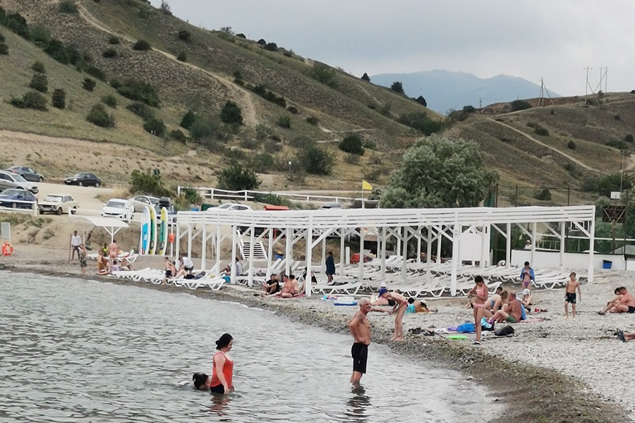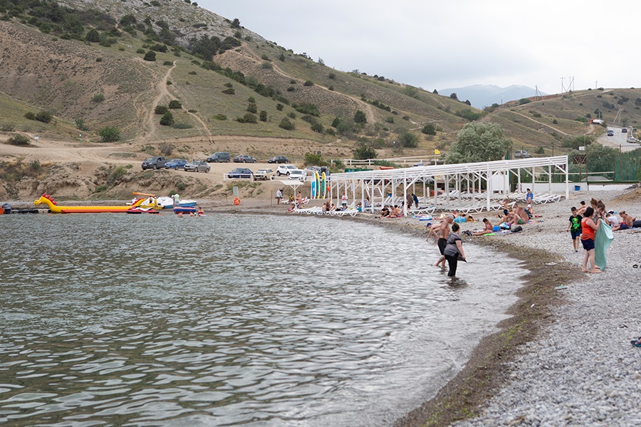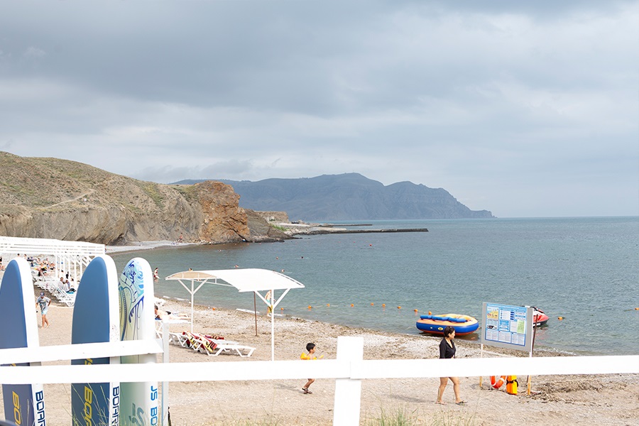 Пейзаж очень живописный: отдыхающие видят и сам мыс, и горные тропки, и резкие выступы скал. На этом пляже есть даже волейбольная площадка, что является редкостью и не встречается на других Судакских пляжах.